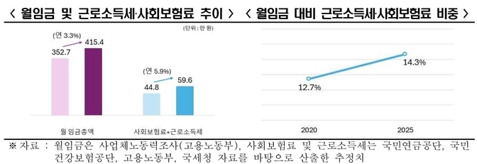 같은 기간 월급에서 원천징수되는 근로소득세와 사회보험료(산재보험 제외)의 합은 2020년 월 44만8천원에서 올해 59만6천원으로 연평균 5.9% 올랐다. 특히 근로소득세(지방세 포함)이 지난 5년간 연평균 9.3% 증가했다. 근소세 증가율이 임금상승률의 3배 가까이 높았다.