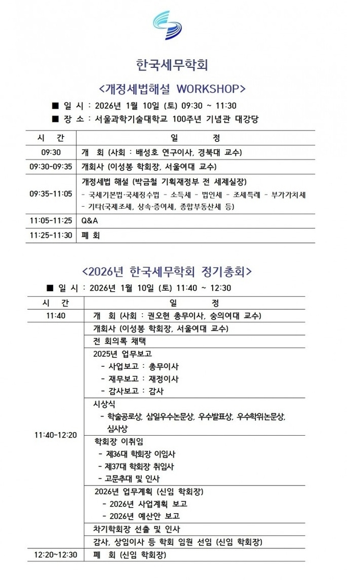 한국세무학회(학회장·이성봉)는 오는 10일 서울과학기술대학교 100주년 기념관 대강당에서 개정세법 해설 워크숍과 정기총회를 개최한다고 5일 밝혔다.