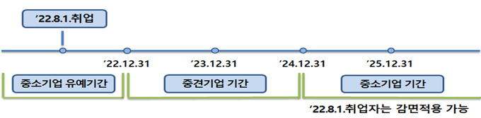 (사례) 2022.4월 A중소기업에 취업한 감면대상자가 2024.4월 퇴사 후, 2025.3월 B중소기업에 재취업한 경우에는 최초 취업일부터 5년간(2022.4월 ~ 2027.4월) 감면 적용 가능.