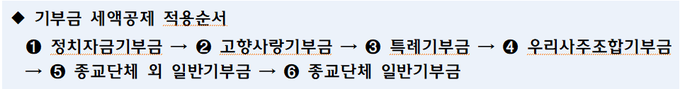 - 같은 유형의 기부금 중 이월분과 당해연도분이 동시에 있는 경우에는 ①이월된 기부금을 우선 공제하고 ②당해 연도 기부금 한도 미달액이 발생하는 경우 당해 연도 기부금 순으로 공제한다.