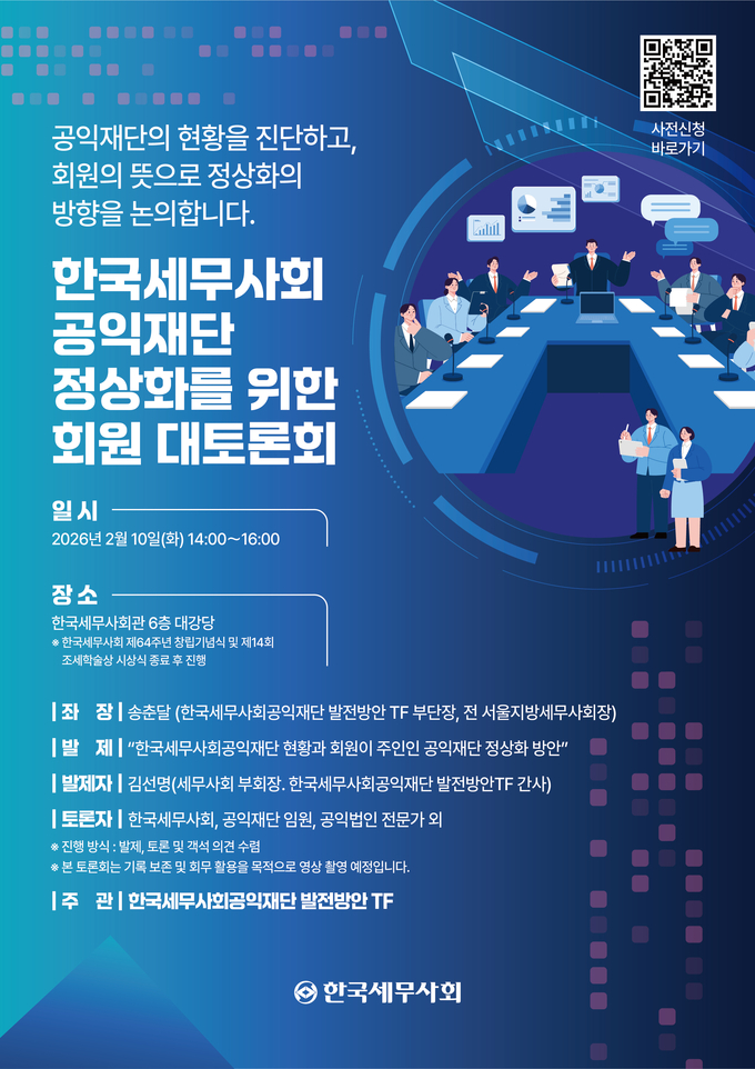 이번 회원 대토론회에서 세무사회는 한국세무사회공익재단의 현황을 진단하고 회원의 뜻으로 정상화의 방향을 논의한다. 토론회는 주제 발제 후 토론과 객석 의견 수렴으로 진행된다.
