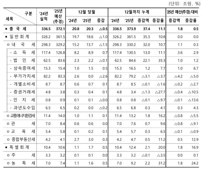 2025년 국세수입은 373조9천억원으로, 전년 336조5천억원 대비 11.1%(37조4천억원) 증가했다.