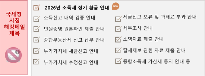 국세청은 2026년 소득세 정기 환급 안내를 사칭한 해킹메일 주의보를 발령하며, 사칭메일로 인한 피해 발생시 경찰청(112, 182)에 신고해 줄 것을 당부했다.