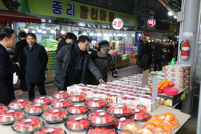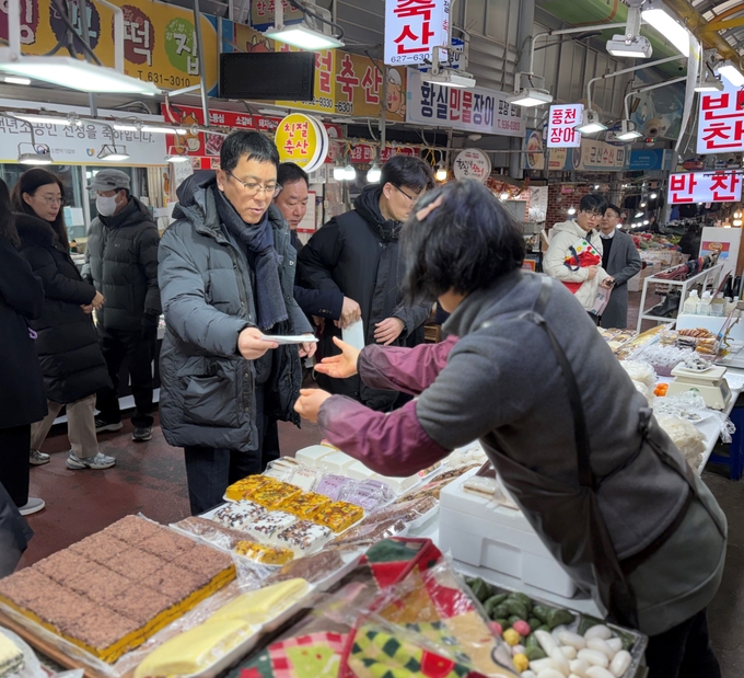 정용대 청장은 11일 대전 대덕구 중리전통시장을 직원 100여명과 함께 방문해 차례용품과 생활용품 등을 구입하며 상인들을 격려하고 명절을 앞둔 시장 경기를 살폈다.