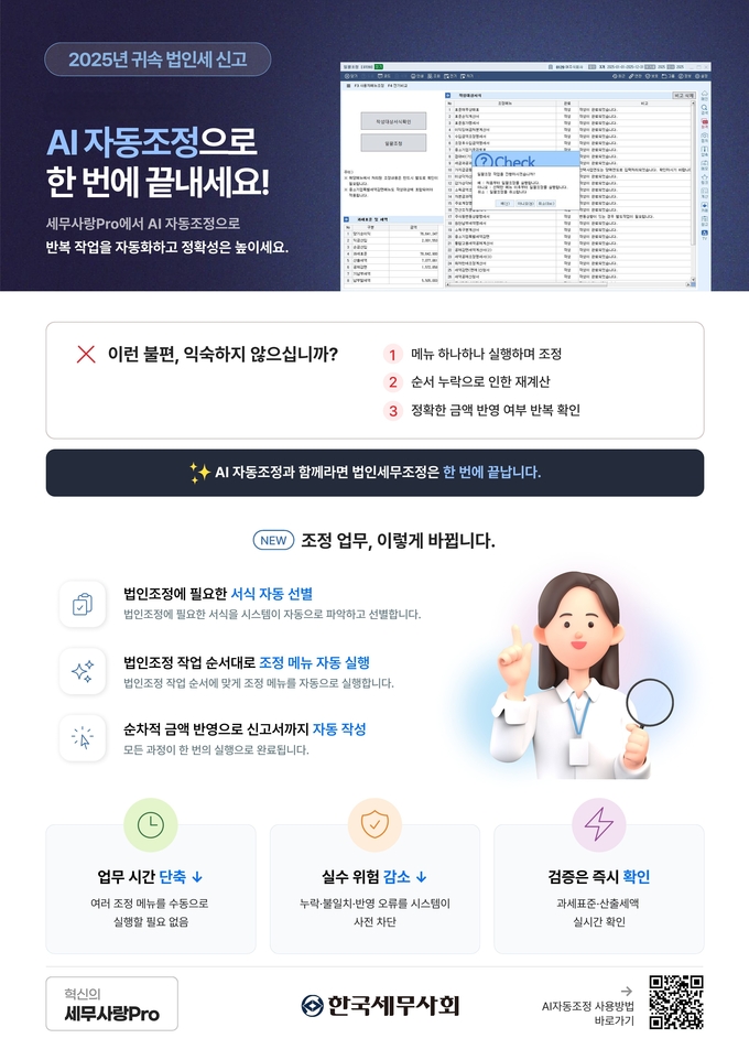2025년 12월말 결산법인의 법인세 신고가 다음달 31일까지 진행되는 가운데, 법인세 조정 업무를 자동화한 ‘AI 자동 조정’ 기능이 선봬 세무사들의 신고 실무에 큰 도움이 될 것으로 기대된다.