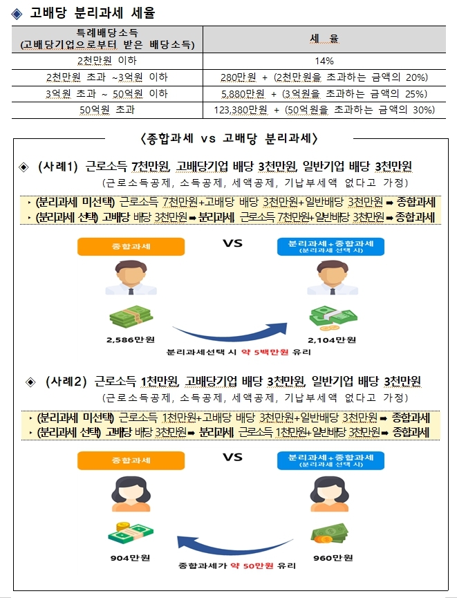 다만, 고배당 분리과세는 자동 적용되는 제도가 아니므로 납세자는 소득 상황을 고려해 종합과세와 분리과세 중 유리한 방식을 선택해야 한다. 예를 들어 근로소득이 7천만 원인 투자자가 고배당기업에서 3천만 원, 일반기업에서 3천만 원의 배당을 각각 받았다면, 분리과세 선택 유무에 따라 약 500만 원의 절세 효과가 차이나므로 자신에게 유리한 방식을 찾아야 한다.