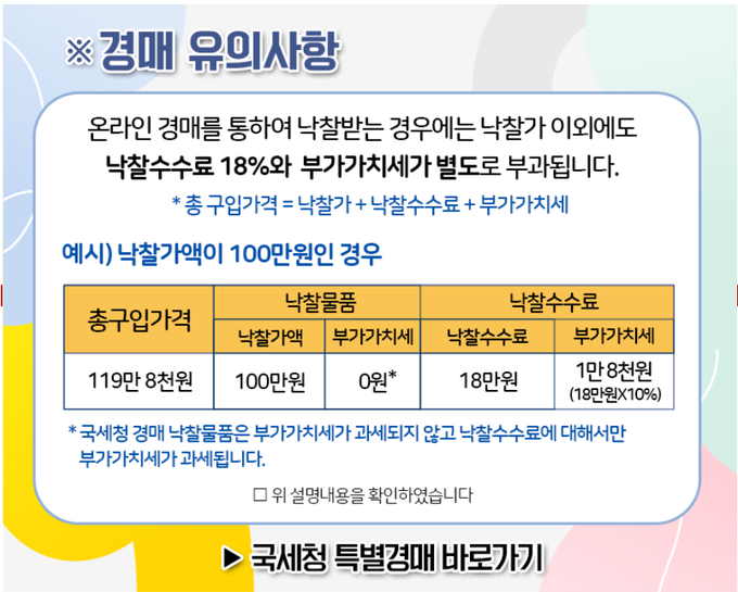 한편, 온라인 경매를 통해 물품을 낙찰받은 경우 낙찰가 외에도 낙찰수수료 18%와 부가가치세가 별도로 부과되는 점을 유의해야 한다.