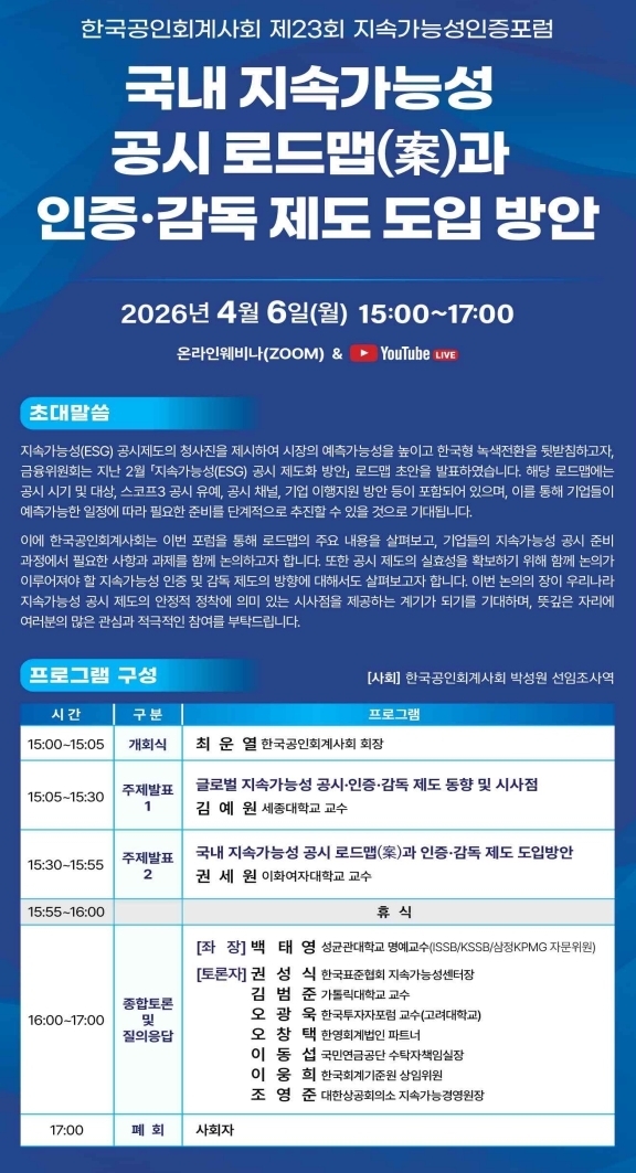 한국공인회계사회(회장·최운열)가 다음달 6일 제23회 지속가능성인증포럼을 웨비나로 개최한다.