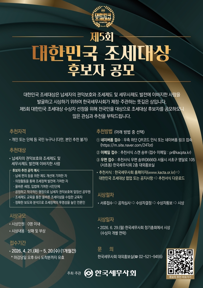 구재이 한국세무사회장은 “대한민국 조세대상은 납세자의 권익을 지키고 더 합리적인 조세제도를 만드는 데 기여한 분들을 사회가 함께 발굴하고 예우하자는 취지의 상”이라며 “입법, 행정, 교육, 언론, 시민사회 등 각 분야에서 조세 정의와 납세자 보호를 위해 힘써 온 숨은 공로자들이 많이 추천되길 바란다”고 말했다.