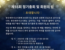 제49회 부산, 제53회 광주 이어 한국세무사고시회(회장·장보원)는 내달 21일 대구 수성구 인터불고호텔 본관 1층 즐거운홀에서 ‘55회 정기총회 및 회원의 밤’을 개최한다고 22일 밝혔다. 이번 정기총회에서는 제55기 사업보고 및 결산안, 제56기 예산안 등의 안건을 처리할 예정이며, 정기총회 이후 만찬과 회원의 밤 행사가 진행된다. 앞서 한국세무사고시회는 제49회 정기총회를 부산 파라다이스호텔에서, 제53회 정기총회를 광주 서구 소재 광주홀리데이인호텔 3층 컨벤션홀에서 개최한 바 있다.