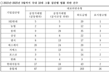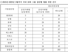 10년간 대기업그룹 공정위 소관 법률 위반 443건 달해 지난 10년여간 국내 10대 대기업그룹의 공정거래위원회 소관 법률 위반이 443건에 달하는 가운데, 현대자동차가 80건으로 가장 많은 것으로 나타났다. 강민국 의원(국민의힘)에서 15일 공정거래위원회로부터 받은 ‘10대 집단 공정거래위원회 소관 법률 위반 내역’을 살펴보면, 지난 2015년~올해 9월까지 국내 대기업 10대 그룹의 공정거래위원회 소관 법률 위반건수는 총 443건에 달했다. 대표적인 4개 위반 유형별로 살펴보면, 총 443건 중 하도급법 위반이 203건(45.8%)으로 절반 가까이 차지했다. 다음으로 공정거래법상 공시규정 위반 127건(28.7%), 공정거래법 공동행위 위반 87건(19.6%), 표시광고법 위반 26건(5.9%) 순이다. 대기업 집단별로 보면 현대자동차가 80건(18.1%)으로 가장 많았다. 다음으로 롯데그룹 75건(16.9%), SK그룹 71건(16.0%), 엘지그룹 47건(10.1%), 삼성그룹 39건(8.8%), 지에스그룹 33건, HD현대그룹 31건(7.4%), 포스코·농협 각 24건(5.4%), 한화그룹 19건(4.3%) 순이다. 특히 현대자동차의 하도급법 위반은