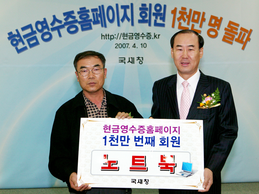 전군표 국세청장은 2007.4.10(화) 2005.1.1일부터 약 2년3개월 만에 현금영수증홈페이지 회원가입 1천만번째 가입한 정광수 씨에게 기념품으로 노트북을 전달하였다.(사진 왼쪽부터 정광수 씨, 전군표 국세청장)