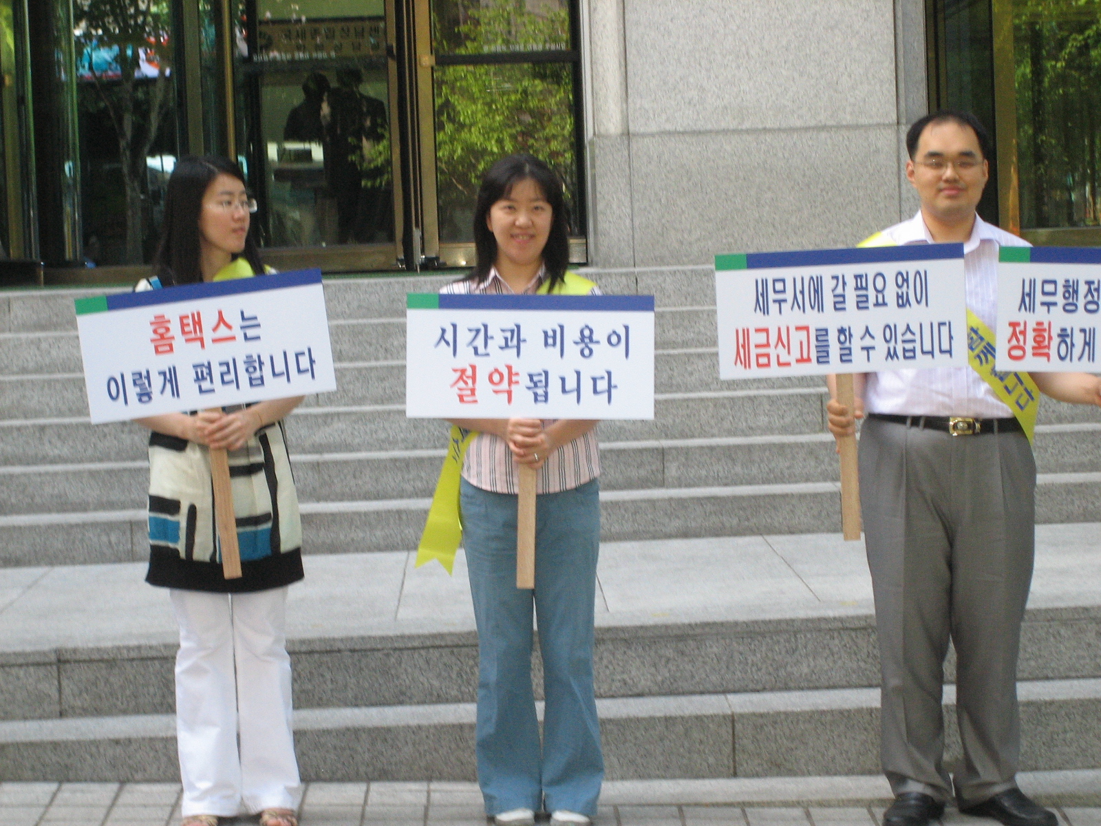 민원봉사실 직원들이 홈택스 가두홍보에 나선 것은, 납세자가 가정이나 사무실에서 인터넷·휴대폰을 이용해 전자신고·전자고지·전자납부·전자민원증명 등 다양한 국세업무를 편리하게 처리할 수 있는 인터넷 국세서비스인 ‘국세청 홈택스’를 홍보하기 위해서였다.