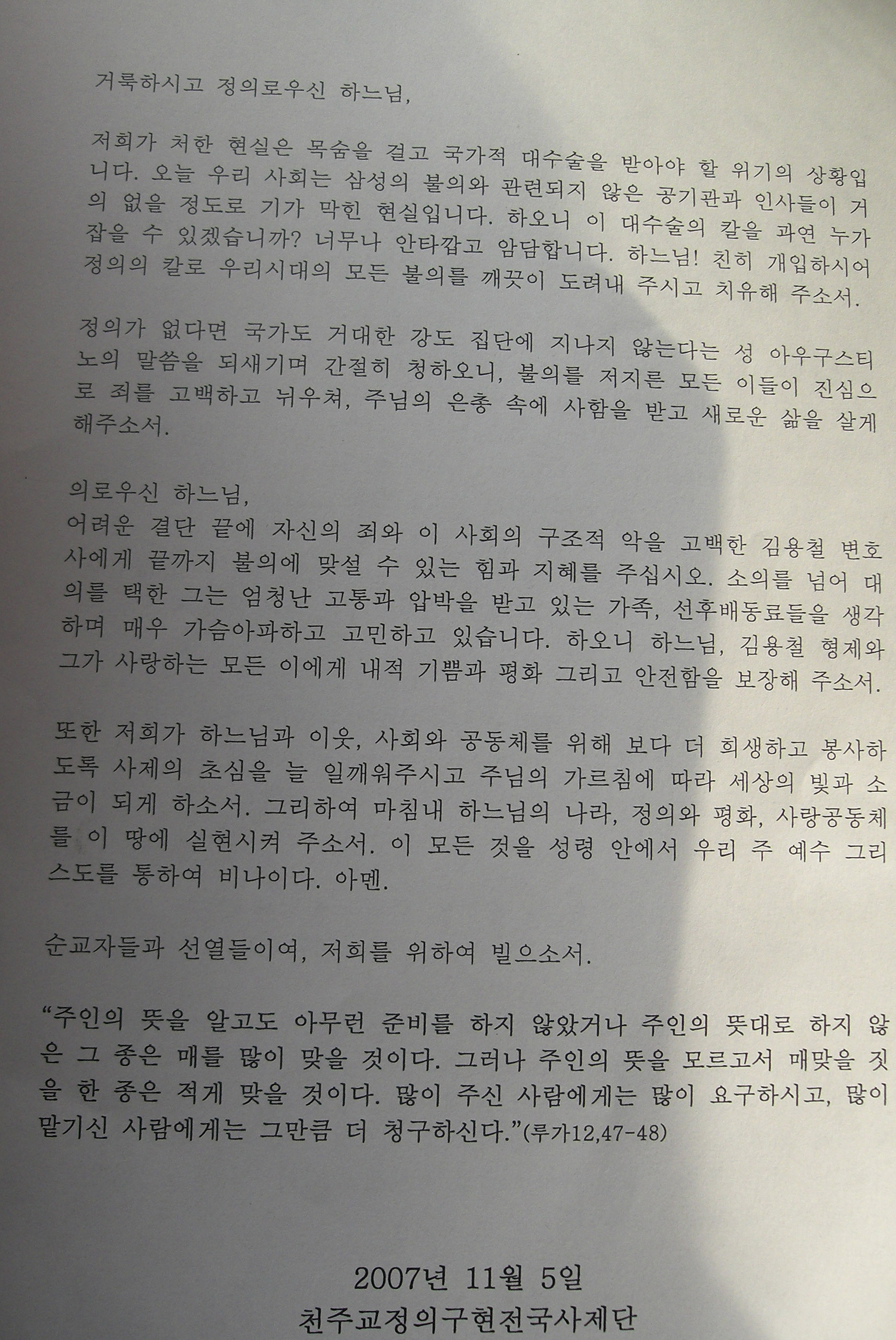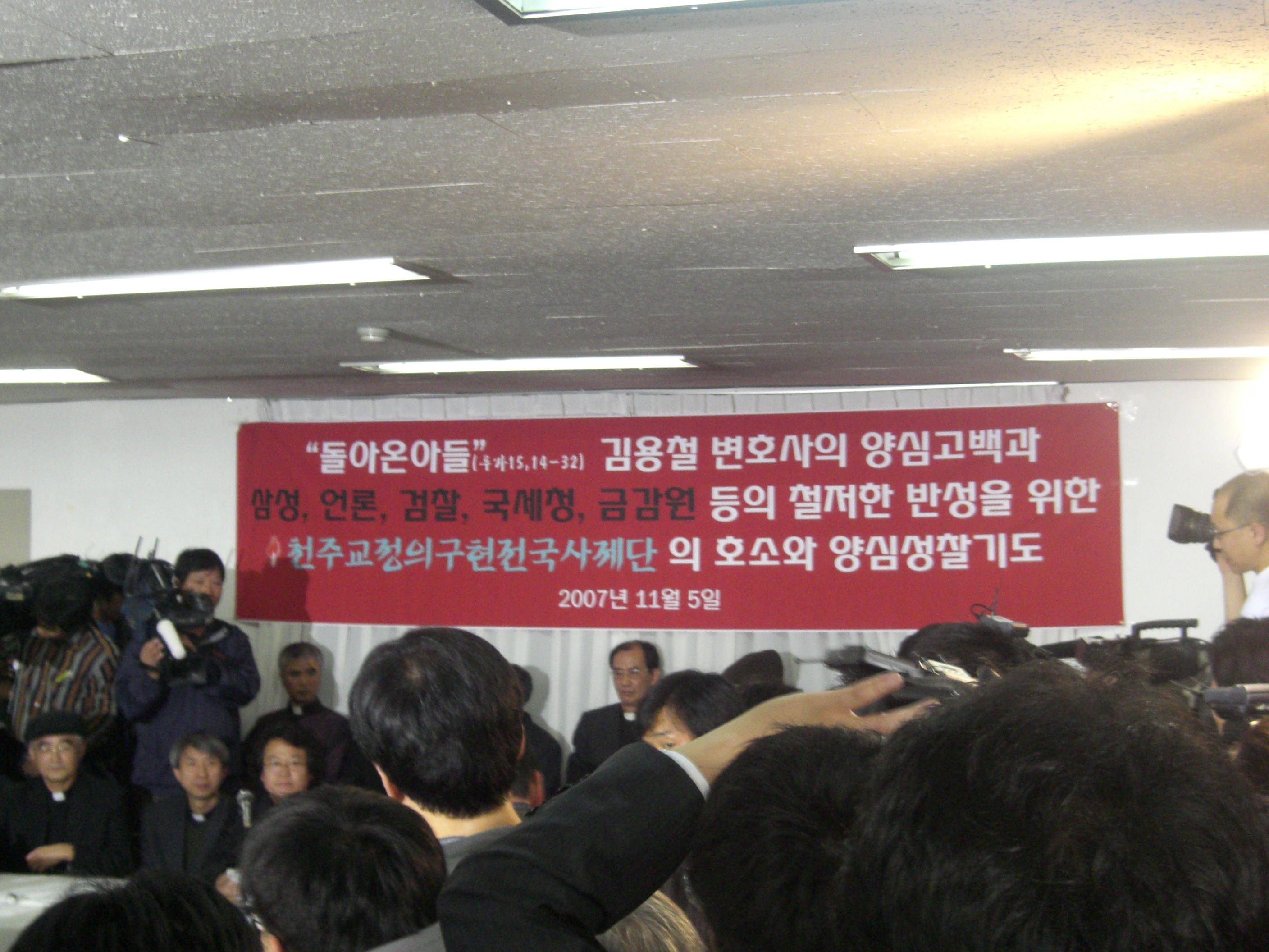 삼성그룹 비자금 조성과 애버랜드 편법증여 등에 관한 양심선언을 위해 동대문 소재 제기동 성당 기자회견장을 들어서는 김용철 변호사.