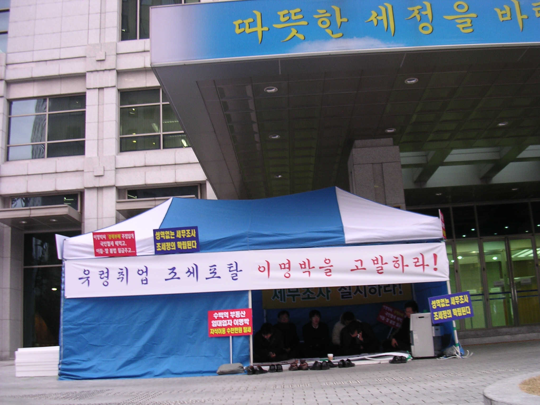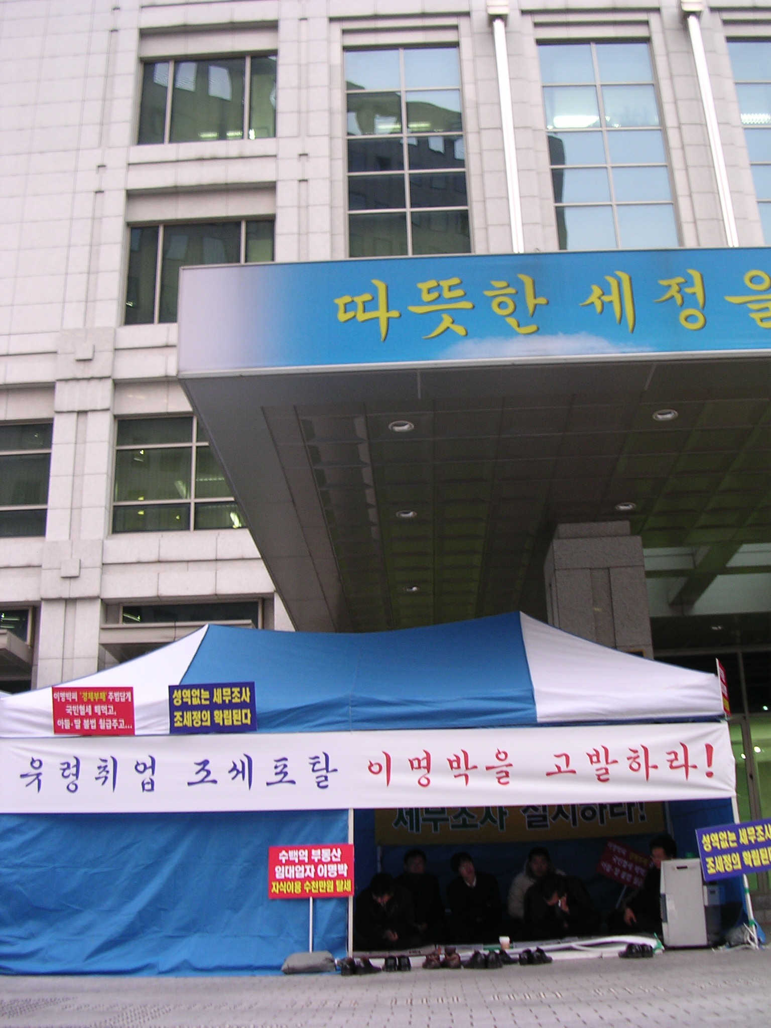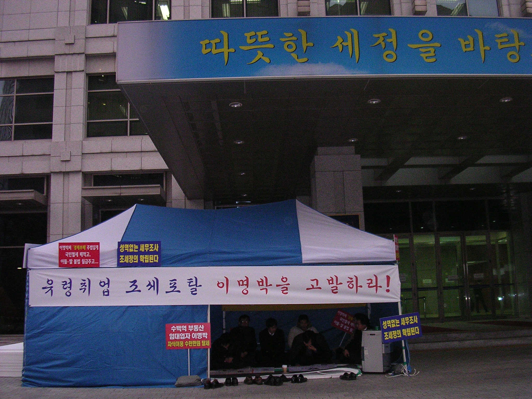 대통합민주신당 당직자들이 19일 오후 국세청 앞에서 한나라당 이명박 후보 자녀의 위장 채용 및 조세포탈 의혹에 대한 세무조사 실시를 촉구하는 천막 농성을 벌이고 있다.