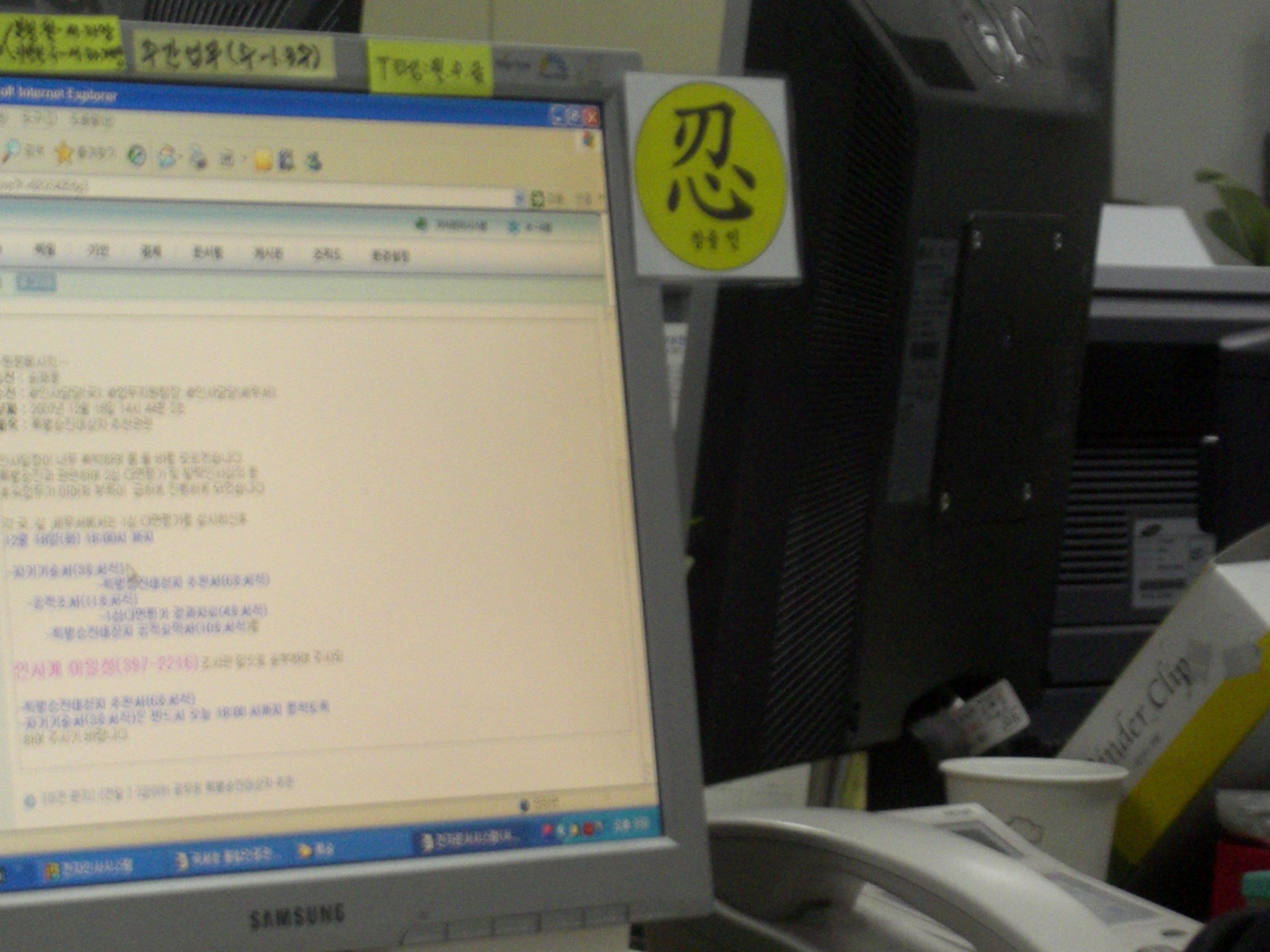 컴퓨터 모니터 옆에 붙여진 참을 '忍'자가 이를 반증하는 것 같다.