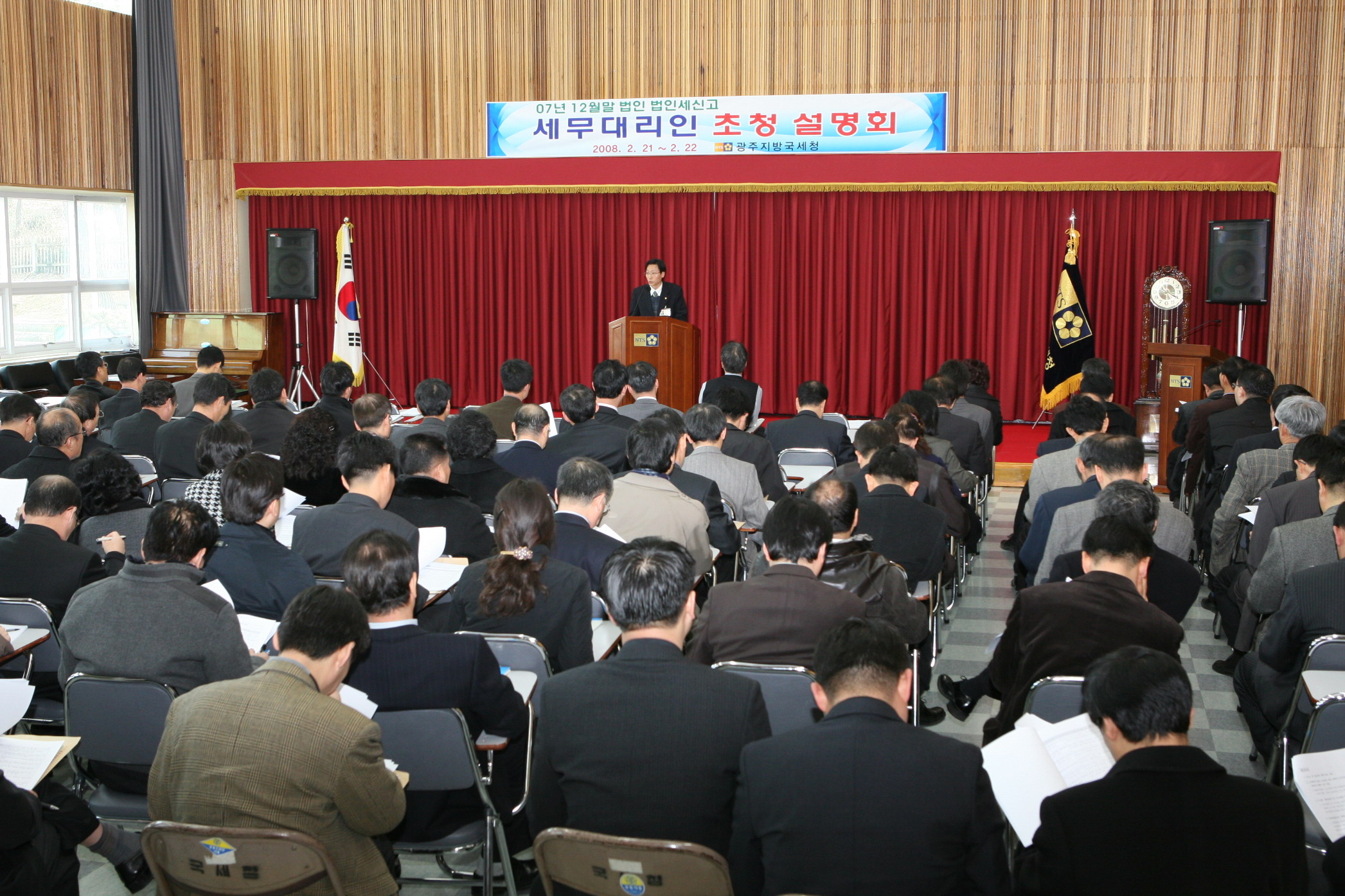 광주지방국세청(청장.김정민)은 오는 3월 법인세 신고와 관련, 21일 지방청 대회의실에서 160여명의 세무사 및 공인회계사 등 세무대리인이 참석한 가운데 2008년 법인세 신고안내 설명회를 개최했다.
