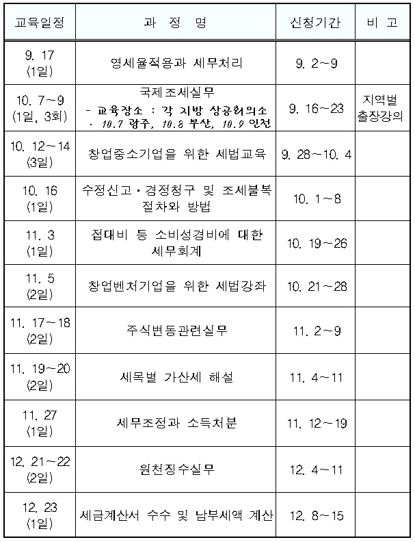 한편, 교육원 관계자는 “올 하반기에는 창업 중소기업을 위한 세법강좌 등 총 11개 과정의 세법강좌를 운영할 계획”이라며, “기업에서 개설을 원하는 분야의 세법강좌를 수시로 파악해 원하는 분야의 강좌를 개설해 운영할 방침이다”고 말했다.