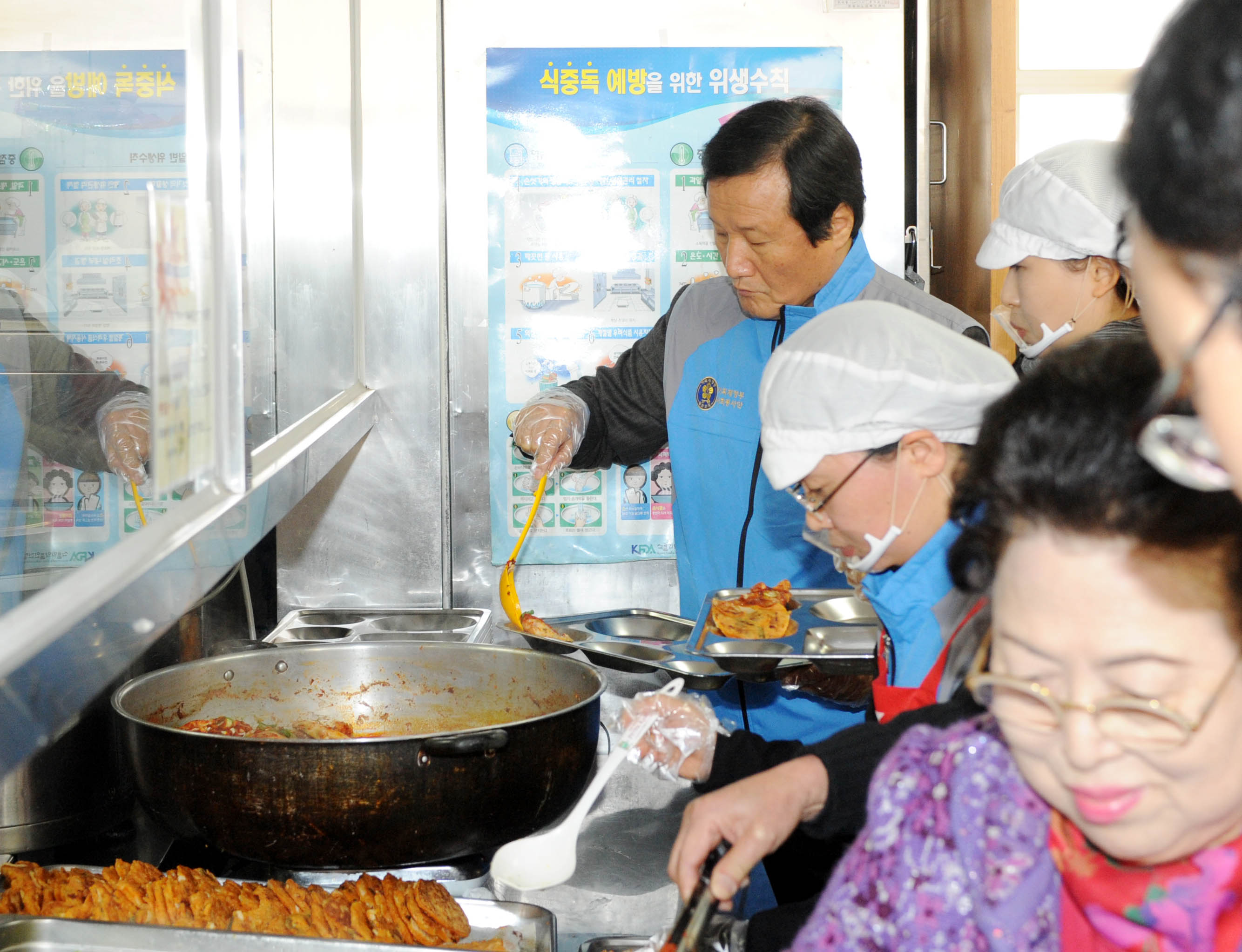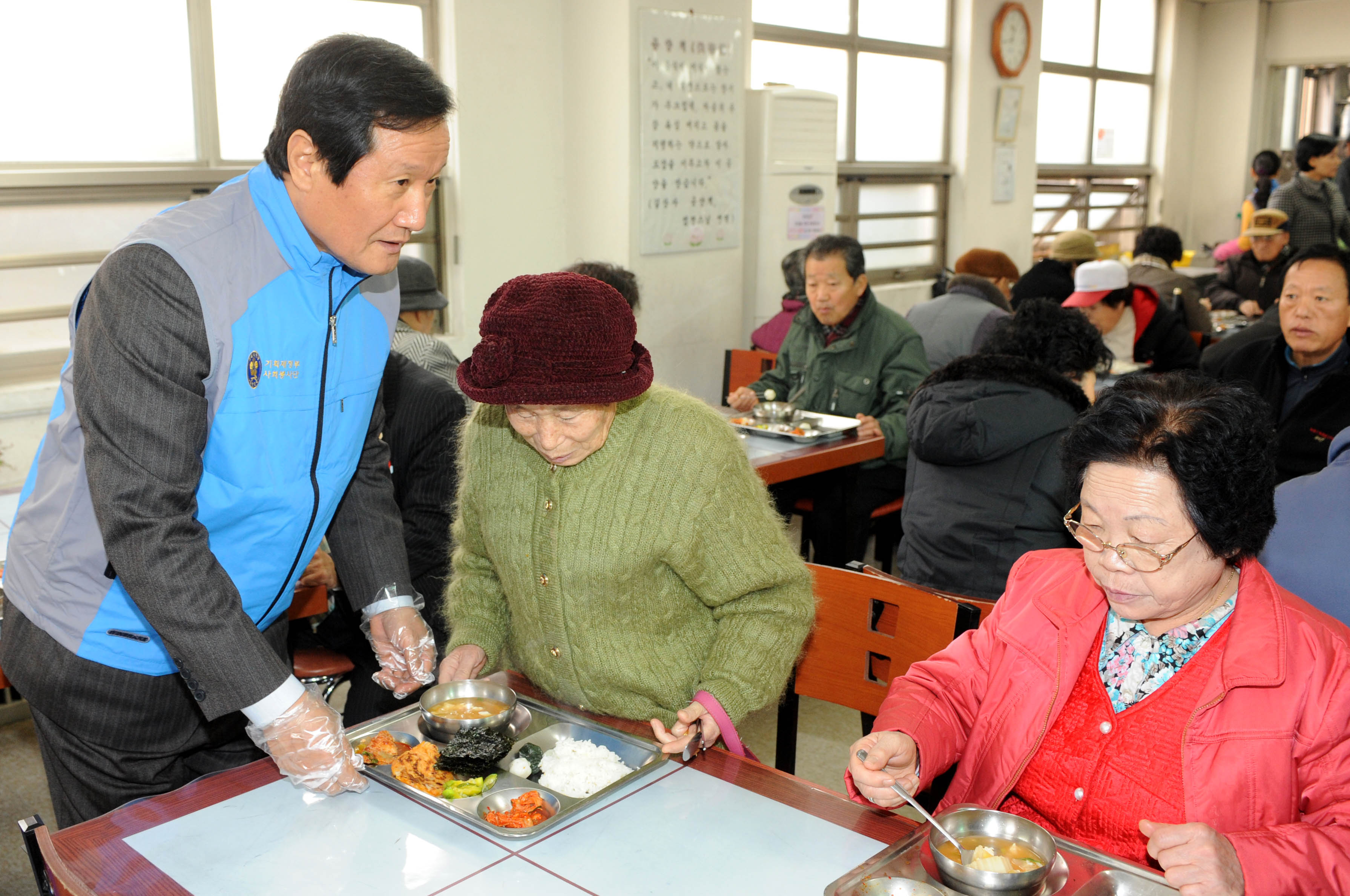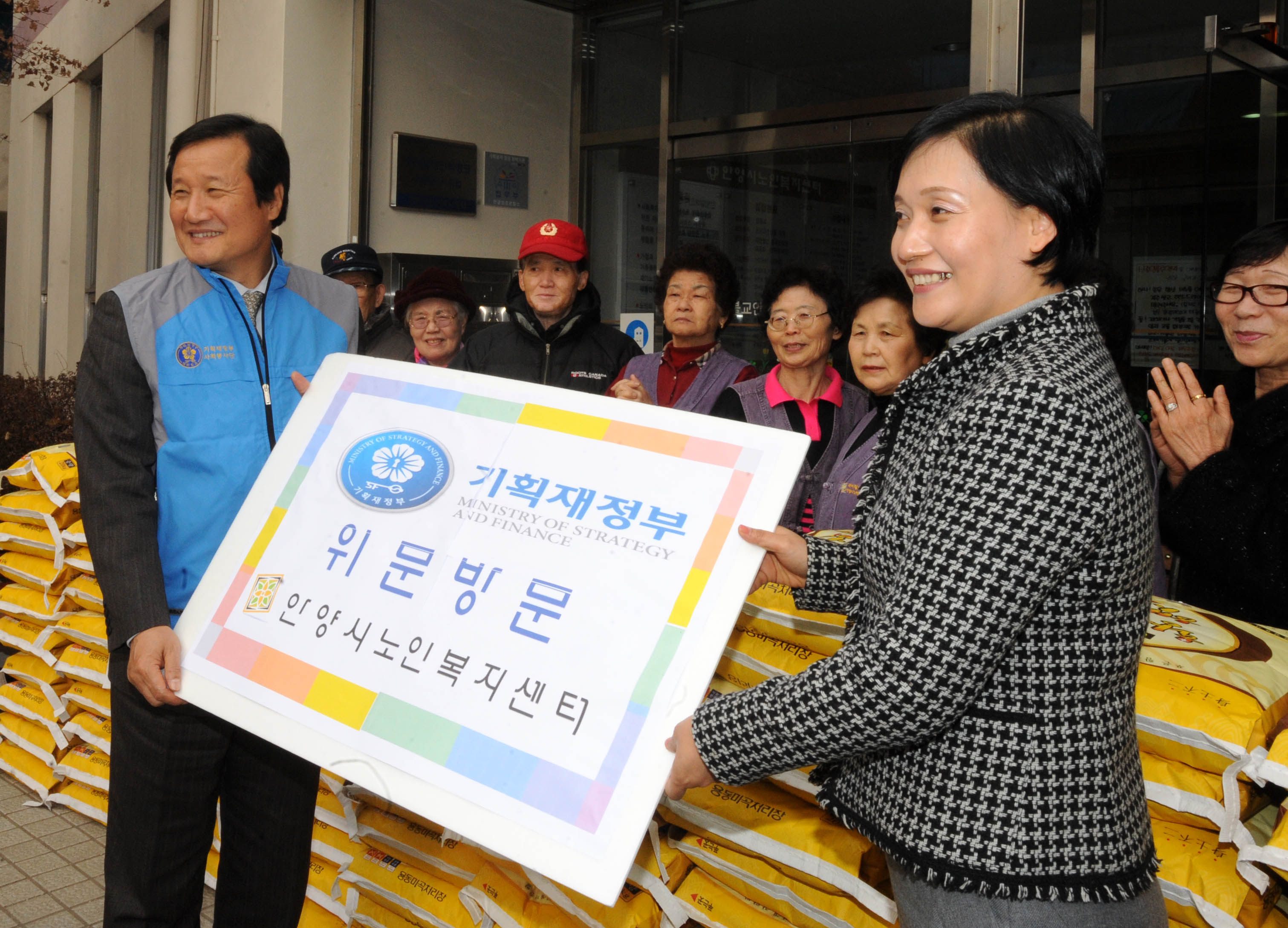 윤증현 기획재정부 장관이 24일 안양시 노인복지센터(관장 박양숙)를 방문, 재정부 직원들과 어르신들의 점심식사를 배식하고 위문품을 전달했다.