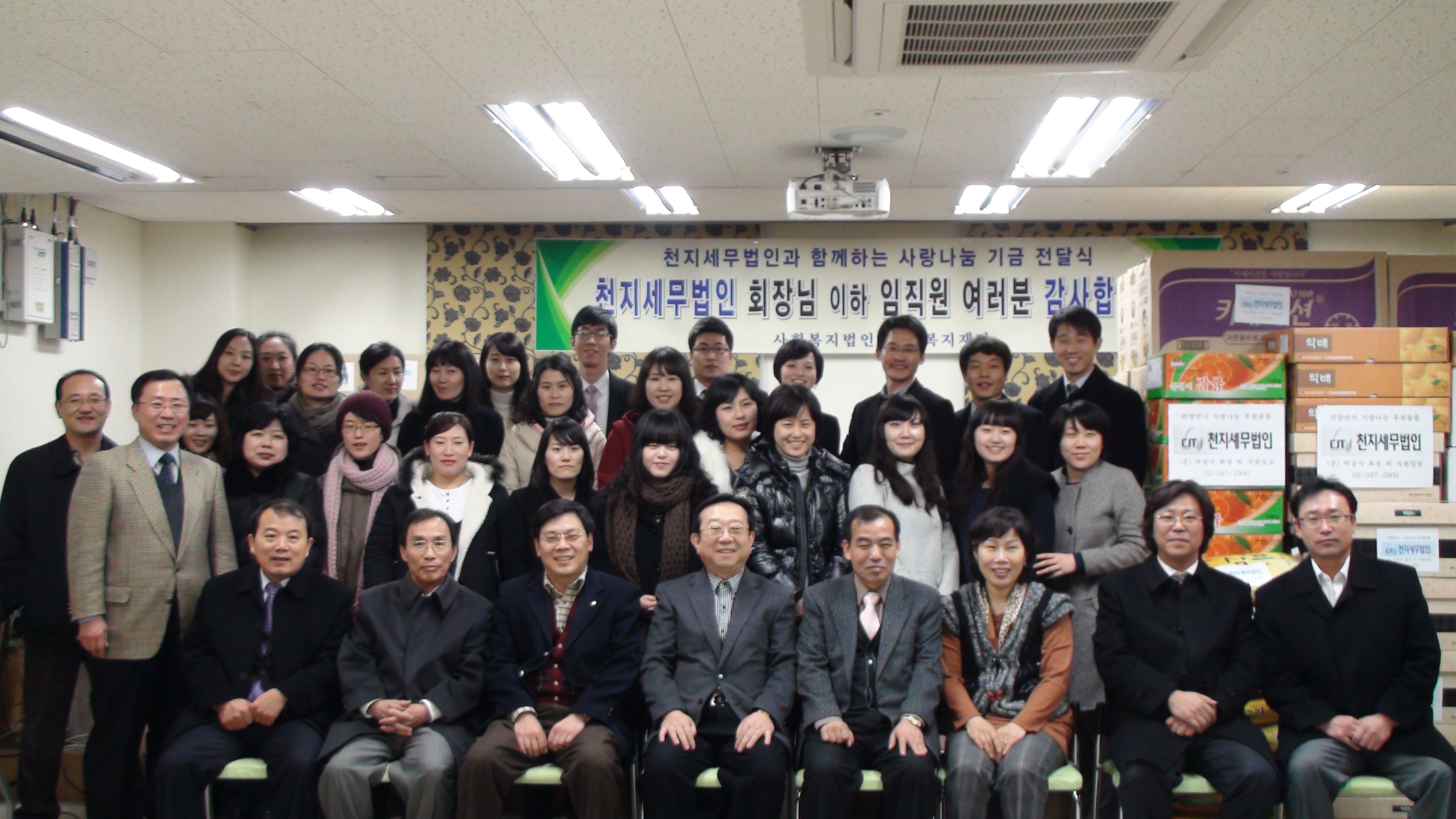 천지세무법인은 서울 공릉동에 소재한 평화복지재단(이수남 원장)에 사랑의 기부금을 전달하였고, 독거노인들에게 사랑나눔 후원물품을 전달하면서 뜻 깊은 연말을 보냈다.