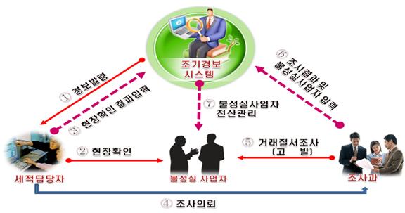 이에 국세청은 전자세금계산서 조기경보시스템은 자료상혐의자 등에 대해 최초의 거짓세금계산서 교부자부터 최종 거래자까지 흐름을 신속하고 간편하게 파악·분석이 가능하므로 이들 거래자 전체에 대해 신속한 경보발령 및 조사를 실시할 계획이다