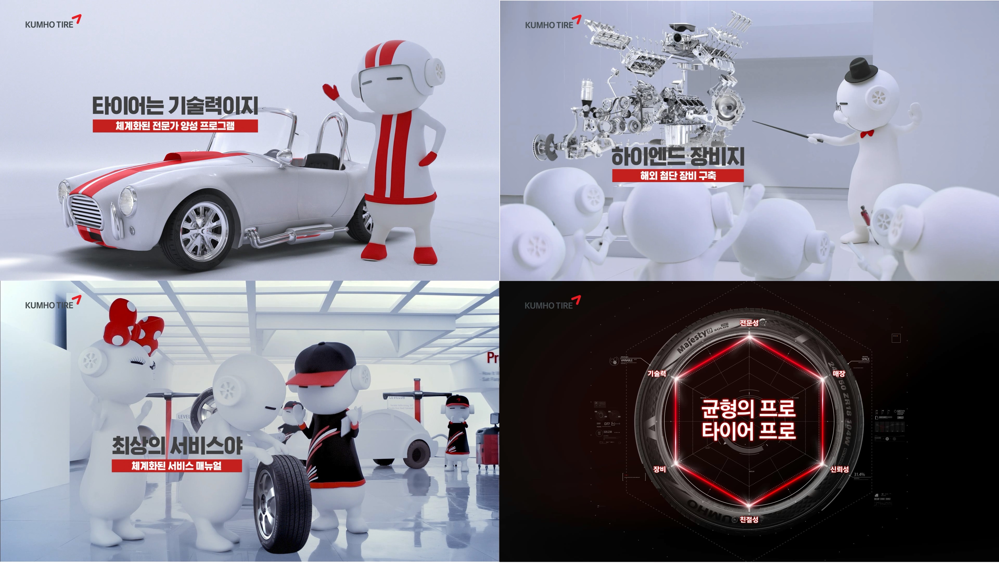 금호타이어의 '균형의 프로' 광고는 '균형의 프로, 타이어프로'라는 메인 카피를 중심으로 금호타이어의 캐릭터 '또로'와 '로로'가 타이어 교체할 때 가장 중요한 것은 기술력, 첨단 장비, 최상의 서비스까지 모든 것의 균형이기 때문에 균형의 프로인 '타이어프로'를 찾아간다는 내용이다.