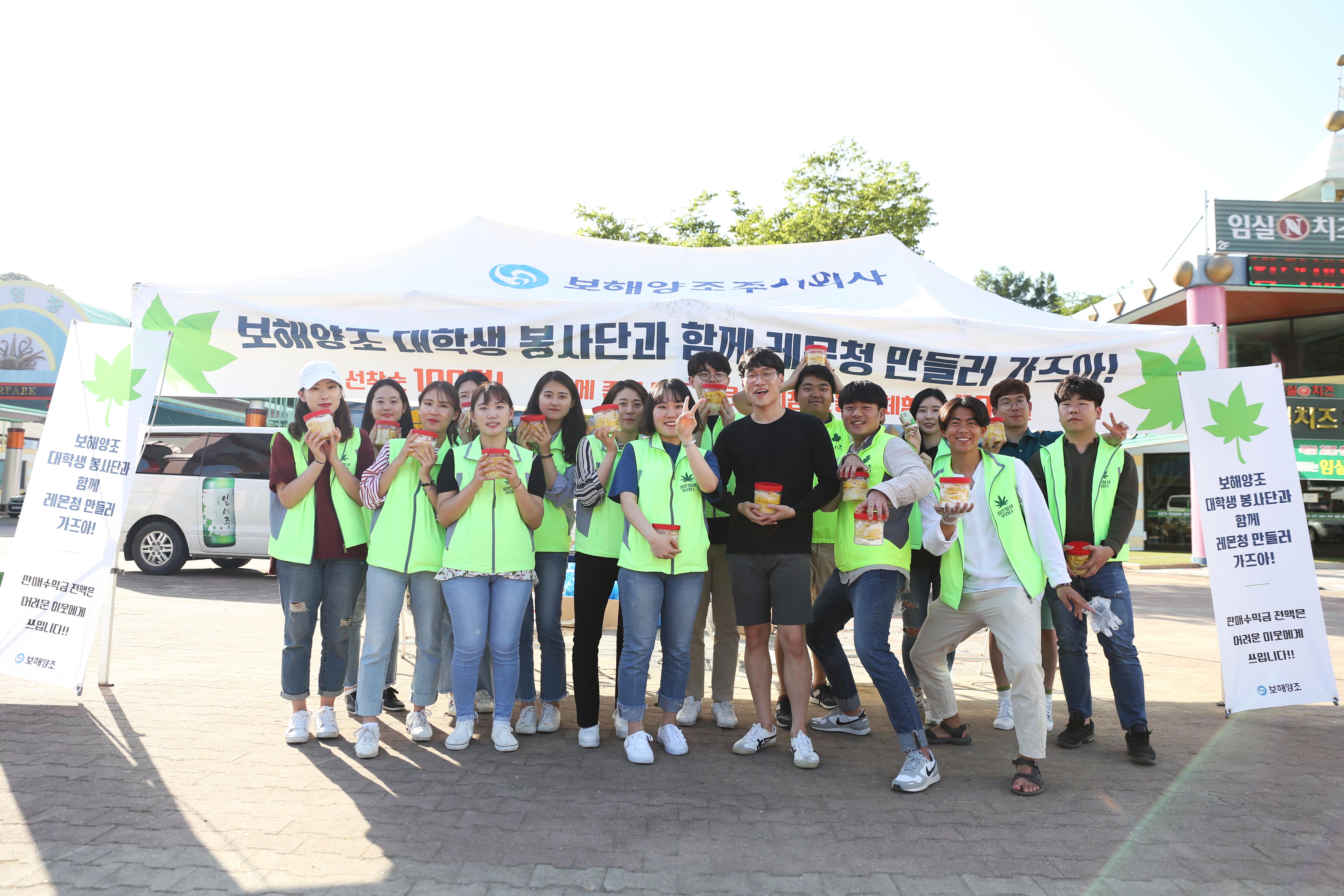 보해양조 젊은잎새 대학생 봉사단 23기 학생들이 지난 26일 광주패밀리랜드에서 레몬청을 판매했다. 젊은잎새 봉사단 20여명은 이날 광주패밀리랜드 대관람차 앞에서 방문객들에게 레몬청을 팔아 수익금을 얻었다.