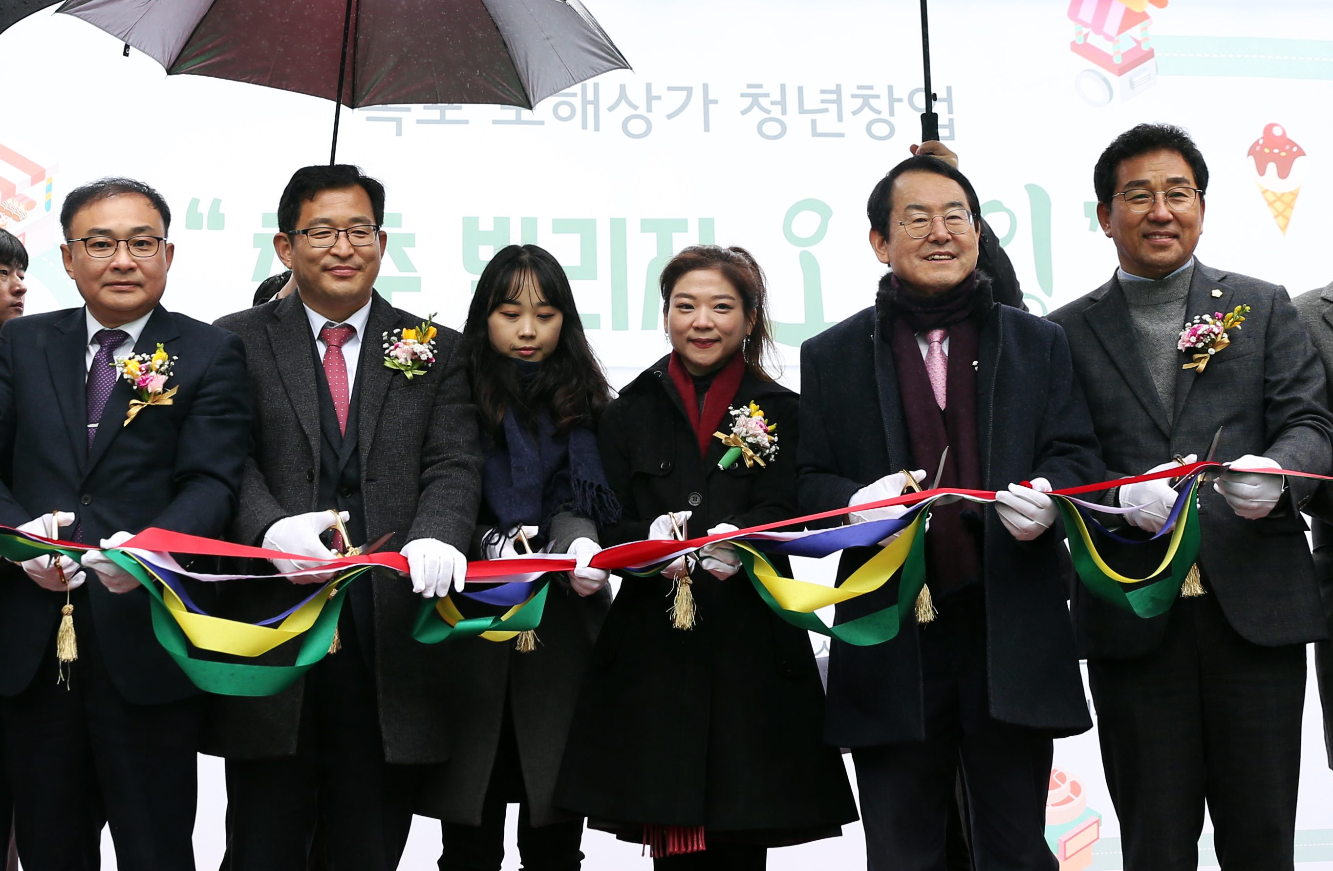 19일 목포시 대안동 보해양조 본사 인근 광장에서 열린 청년점포 '청년빌리지 오쇼잉' 개업식에는 임지선 보해양조 대표를 포함해 김종식 목포시장, 김휴환 목포시의장 등 100여명의 관계자들이 참석해 청년상인들을 응원했다.