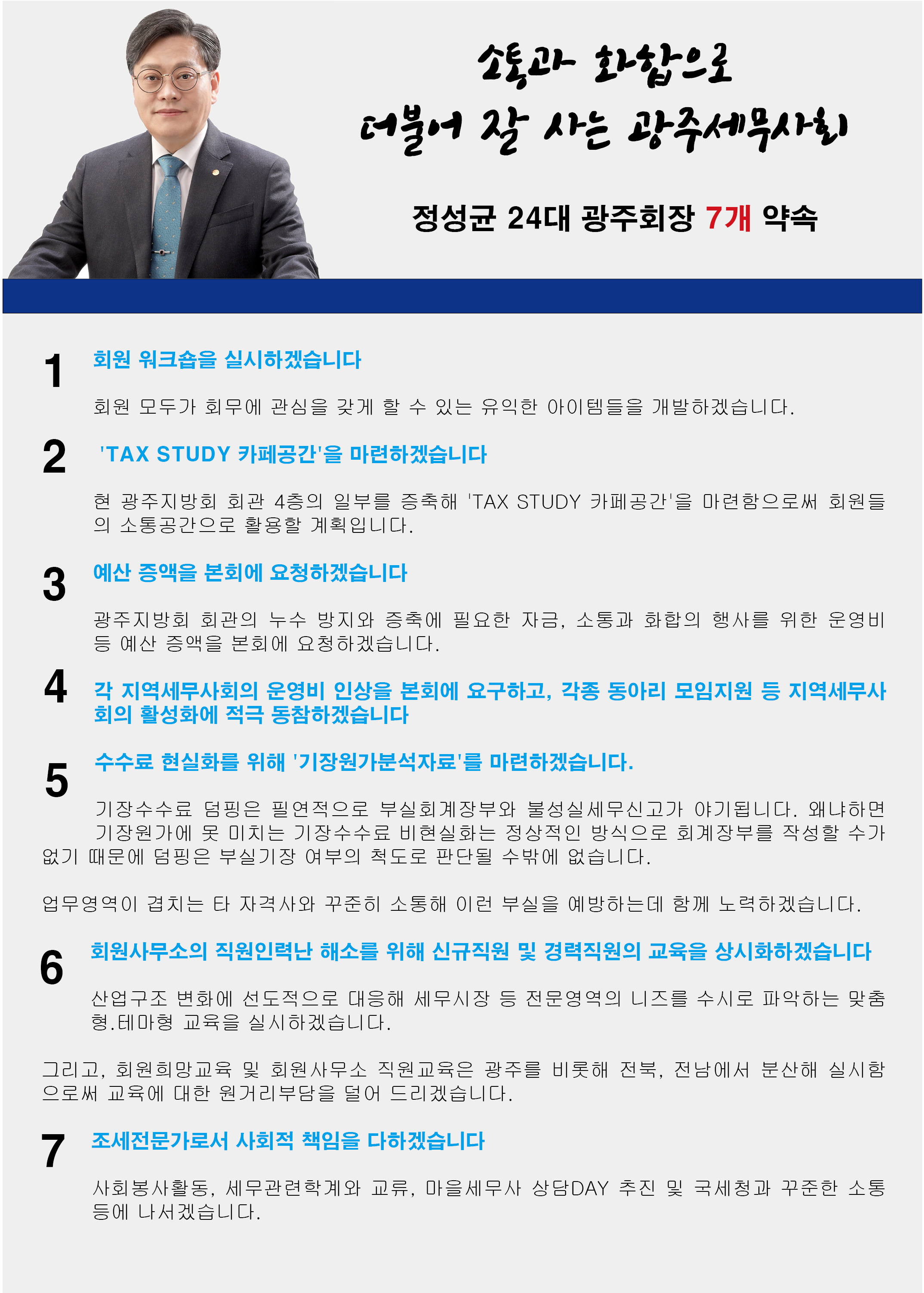 저는 각 지역세무사회의 운영비 인상을 본회에 요구하고, 각종 동아리 모임지원 등 지역세무사회의 활성화에 적극 동참하겠습니다."