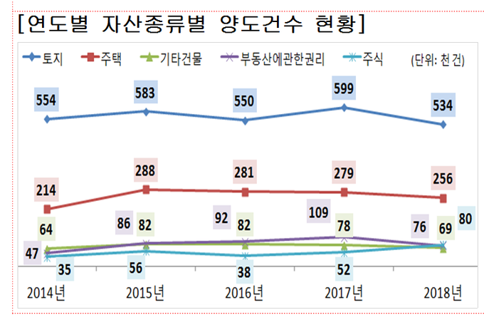 자산 종류별로는 토지 53만4천건(-10.8%), 주택 25만6천건(-8.2%), 기타건물 6만9천건(-11.9%), 부동산에 관한 권리 7만6천건(-30.3%)가 각각 전년 대비 감소했다. 반면 주식, 기타자산, 파생상품은 각각 8만건(52.1%), 3천400건(21.5%), 2만1천건(37.2%) 증가했다.