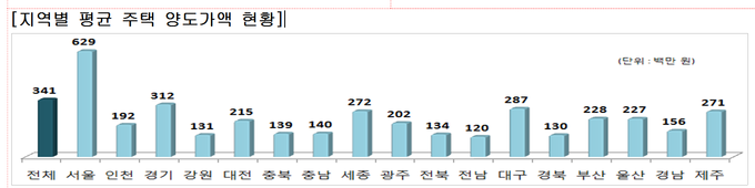 평균 양도가액을 부동산 소재지별로 보면, 서울이 6억2천900만원으로 가장 높았고, 이어 경기 3억1천200만원, 대구 2억8천700만원 순이었다.