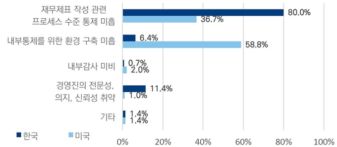 보고서에 따르면, 미국은 회계 인력 및 전문성 부족, IT 통제 또는 전산시스템 미비, 업무 분장 미흡 등 내부통제 환경이 제대로 구축되지 않은 사유로 인한 비적정 비중(2018년 사업연도 기준)이 58.8%로, 한국의 6.4%보다 9배 가량 높게 나타났다.
