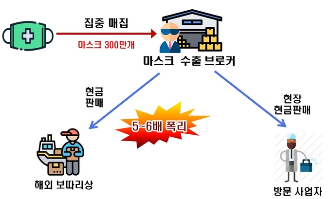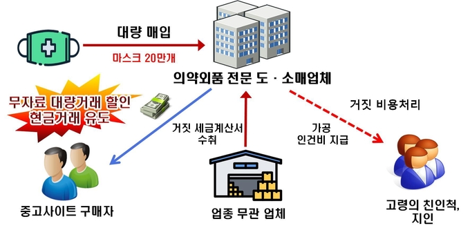 유통업체를 운영하는 A는 주로 산업용 건축자재를 취급하며 마스크를 판매하지 않았다. 그러나 코로나19 사태가 벌어지면서 약 20억원에 달하는 보건용 마스크 300만장을 사들였다. 이후 A는 현금 거래를 제시하는 해외 보따리상이나 거래 증빙을 요구하지 않는 소규모 업체들에게 마스크를 약 5~6배에 달하는 가격인 3천500~4천원에 무자료 판매해 폭리를 취한 정황이 적발됐다.