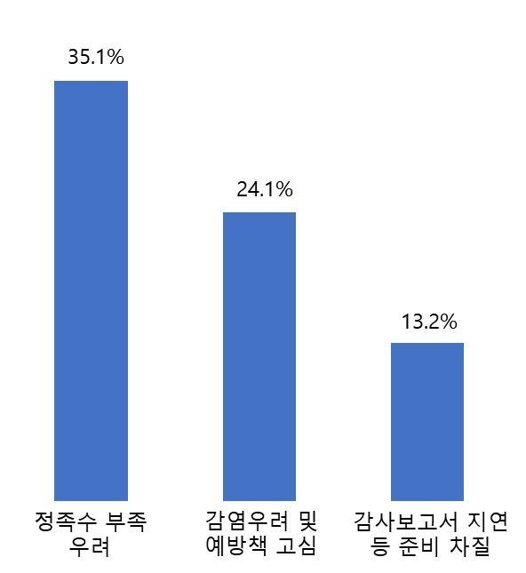 11일 대한상공회의소(회장·박용만)은 지난달 26일부터 이달 3일까지 국내 302개 상장사를 대상으로 ‘2020년 주주총회 주요 현안과 기업애로’를 조사한 결과 상장사들은 가장 큰 애로사항으로 정족수 부족(35.1%)을 꼽았다. 이어 감염우려 및 예방책 고심(24.1%), 감사보고서 지연 등 준비 차질(13.2%) 순으로 답했다.