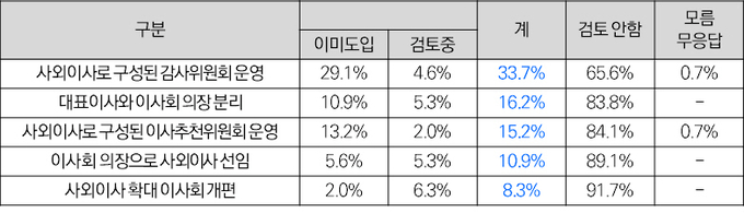 기업들은 스스로 이사회 독립성을 강화하기 위해 △사외이사로 구성된 감사위원회 운영(33.7%) △대표이사와 이사회 의장 분리(16.2%) △사외이사로 구성된 이사추천위원회 운영(15.2%) 등을 이미 도입했거나 도입 검토 중에 있다고 답했다.