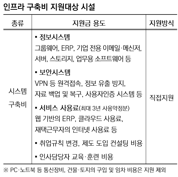 지원대상은 △그룹웨어, ERP, 기업 전용 이메일·메신저, 서버, 스토리지, 업무용 소프트웨어 등 정보시스템 △가상사설망(VPN) 등 원격접속, 정보 유출 방지, 자료 백업 및 복구, 사용자인증 시스템 등 보안시스템 △웹 기반 ERP, 클라우드 사용료, 재택근무자의 인터넷 사용료 등 서비스 사용료(최대 3년 사용약정분) △취업규칙 변경, 제도 도입 컨설팅 비용 △인사담당자 교육·훈련 비용 등 '재택·원격근무의 활용을 위해 직접 설치하거나 사용할 목적으로 취득하는 프로그램·시설·장비'다.