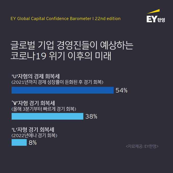 경제 회복세에 대해서는 응답자의 54%가 2021년까지 경제성장률이 둔화된 후 경기가 회복되는 ‘U'자형 흐름을 예상했다. 더 빠른 경기회복을 예상하는 'V'자형에 응답한 비율은 38%, 2022년에나 경기가 회복될 것으로 보는 ’L'자형 응답자는 8%로 나타났다.
