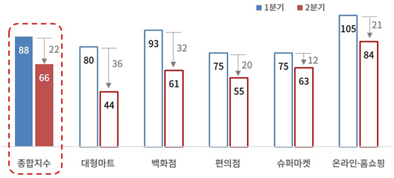 특히 대형마트(44)·편의점(55)·백화점(61)·슈퍼마켓(63) 등에 이어 코로나19 피해 영향이 비교적 적었던 온라인·홈쇼핑(84)도 부정적 전망으로 돌아섰다.