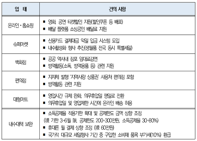대한상의는 업계 건의사항으로 △티켓할인 및 배달 플랫폼 소상공인 배송료 지원(온라인·홈쇼핑) △생필품 전국동시 세일(슈퍼마켓) △지역사랑 상품권 사용처 확대(편의점) △의무휴업일 평일 전환(대형마트) △방역활동 관련 지원(백화점) △정부의 소득공제 적용기간 확대·한도 상향) △휴대폰 결제한도 상향 △대규모 점포 영업규제 개선 △공공 역사내 점포 임대료 감면 △신용카드 결제대금 익일 입금제 도입 등이 있었다고 밝혔다.