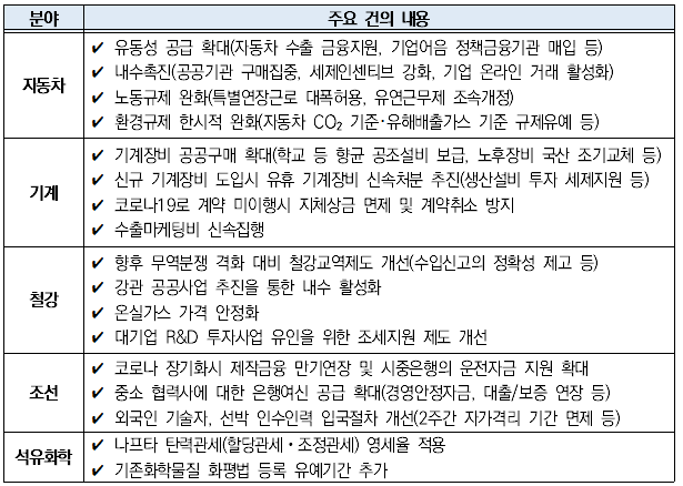 먼저 자동차산업은 △공공기관 차량구매 확대 △친환경차 보조금 강화 △취득세·개별소비세 감면 △4대보험 및 세금 납기 연장 △온라인 거래활성화 △노동규제·환경규제 한시적 완화 등의 정책지원을 제안했다.