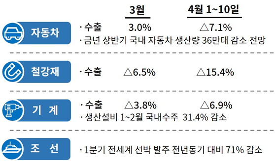 관세청 및 협회 등의 조사에 따르면 제조업계의 피해는 이달 들어 커지고 있다. 수출은 지난 10일까지 철강제품이 약 15% 줄었고, 자동차 국내 생산은 올해 상반기 중 36만대가 감소할 것으로 예상되는 등 타격이 크다.
