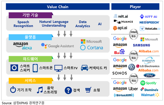 염승훈 삼정KPMG 전자정보통신본부 파트너는 “음성 AI 생태계 구축·선점을 위한 다양한 업체간 제휴·경쟁이 심화되고 있다”며 “이에 따라 관련 M&A가 활발히 진행될 것”이라고 전망했다.