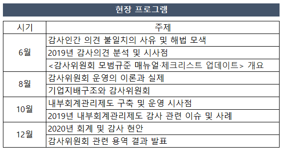 한편, 올해 온라인 프로그램으로는 상·하반기에 걸쳐 △2020년 회계기준 업데이트 △회계부정 조사 가이드라인 △스튜어드십코드 도입 확대 및 그 영향 △상법, 자본시장법 개정 내용과 시사점 △내부감사부서의 역할과 책임 △기업의 리스크 유형 및 관리방안 △재무보고 감독을 위한 재무비율 분석 △디지털 시대의 재무보고와 감사위원회 등이 구성됐다.
