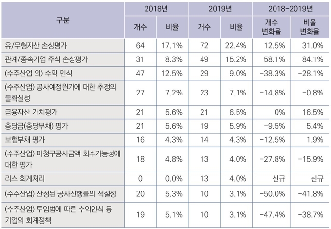 이어 관계·종속기업 주식 손상평가(15.2%)와 수익인식(9.0%)도 선정 빈도가 높았다.