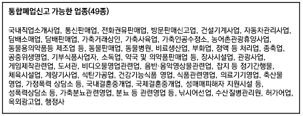 통합폐업신고는 세무서나 시·군·구청 중 한 곳만 방문해 폐업신고할 수 있는 제도다. 지난 2013년 도입한 이래 적용 업종을 점차 확대해 현재 총 49개 업종의 사업자가 이를 활용할 수 있다.