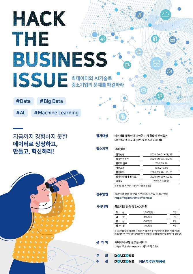 (주)더존비즈온(대표 김용우)은 한국정보화진흥원(NIA)과 함께 전국민 대상 ‘중소·중견기업의 혁신 서비스 발굴을 위한 빅데이터 활용 경진대회’를 개최한다고 2일 밝혔다.