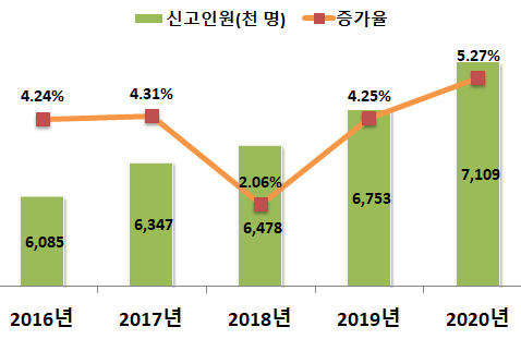 연도별 부가세 신고인원은 2016년 608만5천명, 2017년 634만7천명, 2018년 647만8천명, 2019년 675만3천명, 2020년 710만9천명으로 늘었다.