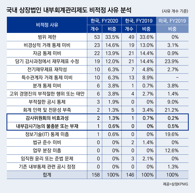 반면 미국은 회계 인력 및 전문성 부족(21.2%), 정보기술(IT) 통제 미흡(19.6%), 업무 분장 미흡(12.6%) 등이 주로 꼽힌다.