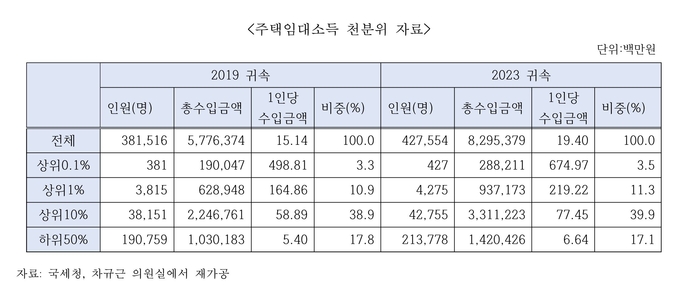 차규근 의원(조국혁신당)이 24일 국세청으로부터 받은 ‘2023년 귀속 주택임대소득 천분위’ 자료를 분석한 결과, 2023년 귀속 주택임대소득자는 42만7천554명으로, 총 금액은 8조2천953억원이다. 1인당 평균 1천940만원을 올린 셈이다.