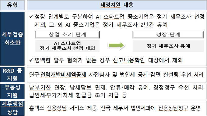 창업 5년 이내인 AI 스타트업 중소기업에 대해서는 정기 세무조사가 제외되고, 그 외 AI 중소기업이 신청하는 경우 착수예정일로부터 최대 2년간 정기 세무조사가 유예된다.